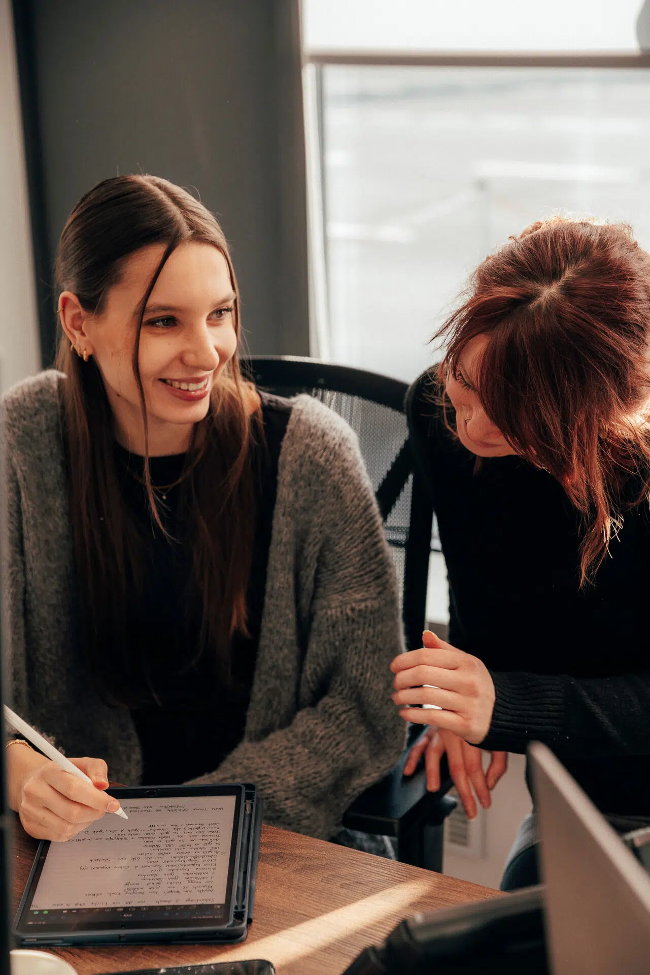 Zwei Personen tauschen sich lächelnd vor einem Tablet aus.