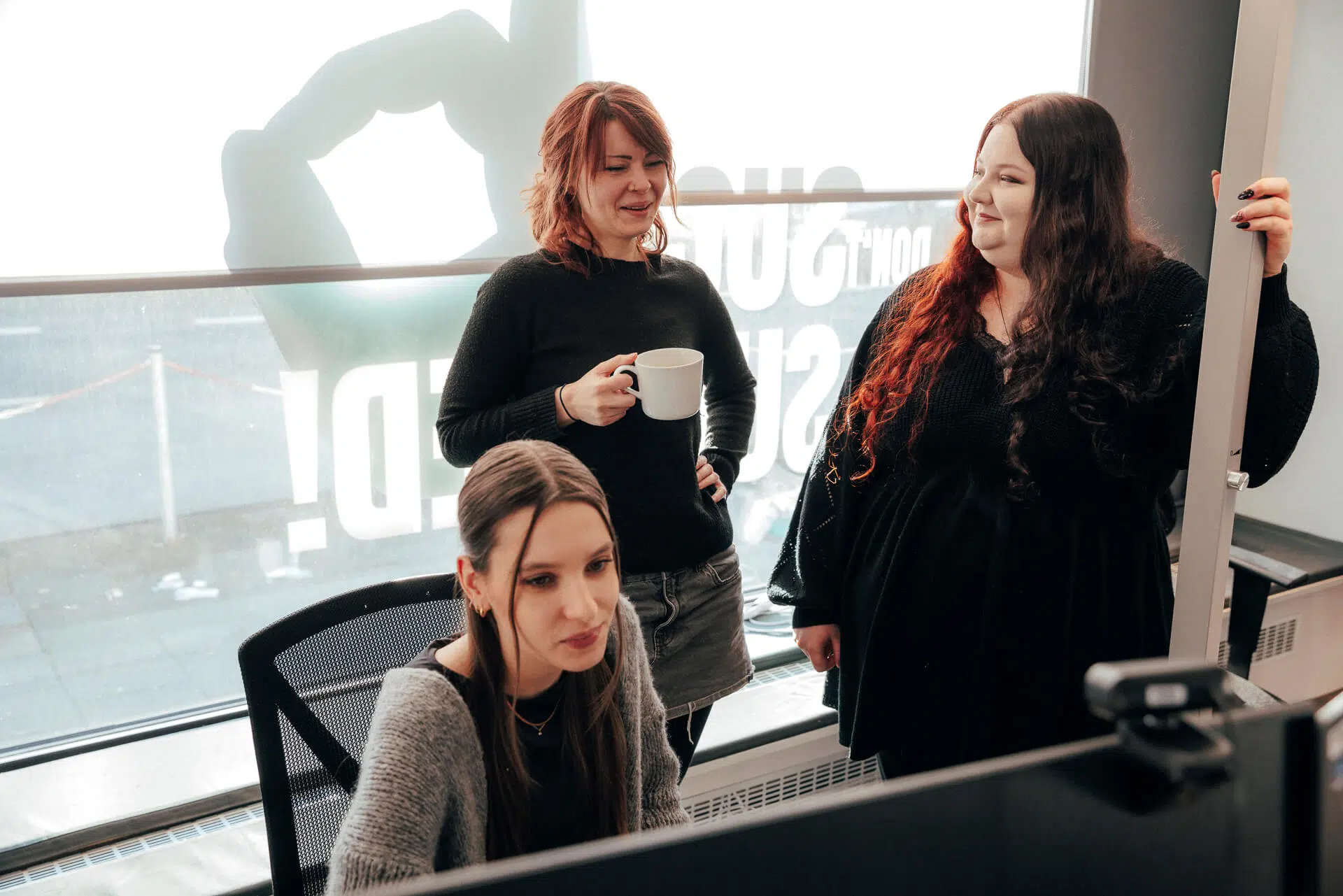Drei Personen sitzen und stehen lächelnd vor einem Bildschirm